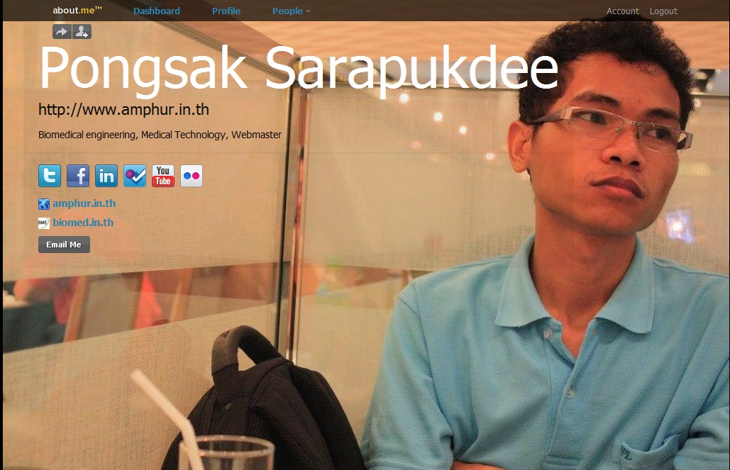 about.me เป็นเว็บเอาไว้แสดงโปรไฟล์ของเรา ใส่ลิงค์พวก social network เข้ามาแสดงด้วย และสามารถส่งให้เพื่อนๆได้ ใครอยากติดต่อเราก็คลิกส่งอีเมลเขียนข้อความแล้วส่งได้เลย ทำให้พอจะเรียกมันว่าเป็น นามบัตรออนไลน์ ก็คงได้ ดูแล้วมันก็คล้ายกับ Google Profiles แต่มันทำออกมาได้ในแบบง่ายๆ ไม่มีอะไรมาก ด้านหลัง มีสถิติคนเข้าดู กับการปรับแต่งและออกแบบได้เล็กน้อย ที่น่าสนใจที่สุด คงเป็นชื่อโดเมนของมัน about.me ถ้าใครสมัครใช้งานก็จะได้ URL ของ User เท่ๆเป็น about.me/username ส่วนโดเมน .me เป็นของประเทศที่เราคุ้นเคยดี คือ Montenegro