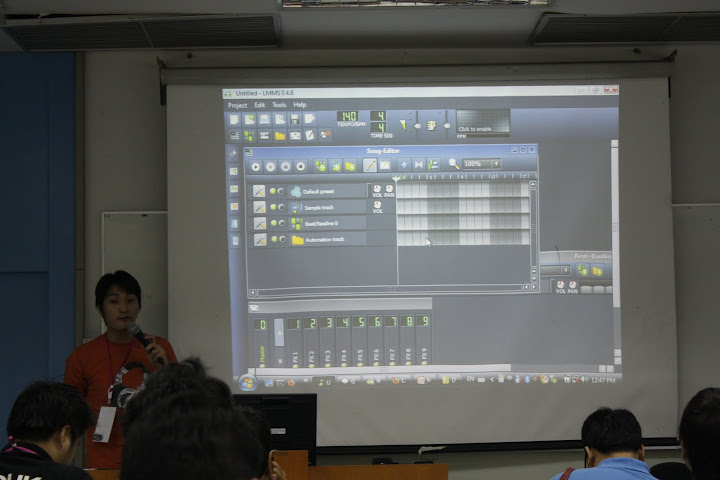 จากนั้นก็ทดลองทำเพลงให้ดูกันสดๆ เครื่องมือก็ใช้ง่าย ลากเสียงมาวางในห้องของจังหวะได้เลย กำหนดจังหวะการเกิดเสียง แล้วทดลองฟัง แต่งเสียงไปฟังไปพร้อมกันได้ ทำงานหลายเลเยอร์ และมีเลเยอร์ย่อยๆอีก ควบคุมเสียงดังเบาแบบละเอียดได้ วนเป็นลูปได้ และที่น่าจะทำให้โปรแกรมนี้น่าสนใจที่สุดคือ library ของเสียง ที่มาพร้อมกับโปรแกรมมีให้เลือกใช้เยอะมาก