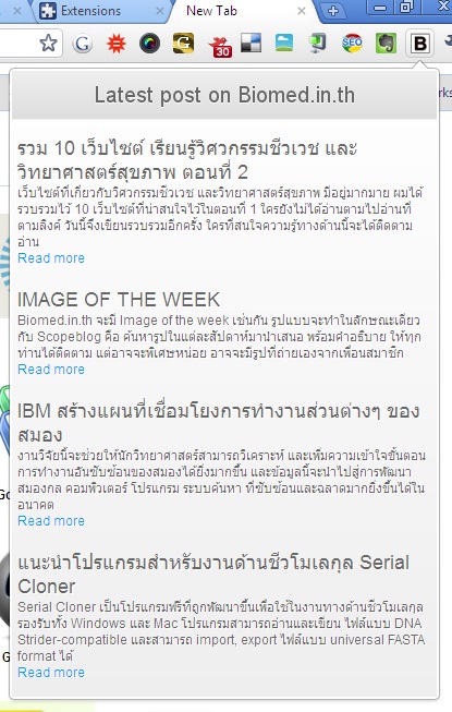 Biomed.in.th Extension for Google Chrome ใครใช้ Chrome อยู่แล้ว ก็คลิกลิงค์แล้วติดตั้งได้เลยครับ ไม่มีอะไรพิเศษ แค่ดึง feed มาแสดง เอาโค้ดมาจาก Tutorial แต่หาวิธีดึงภาพมาแสดงด้วยไม่ได้ (เอาไว้ใน v.2 แล้วกัน) เลยเอามาแค่ text กับลิงค์ก็พอ